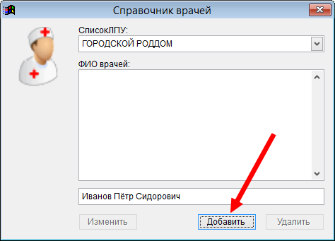 Перед началом работы с картами беременных необходимо заполнить справочник врачей по своему ЛПУ - внести хотя бы одного врача. Перейдите в меню "Справочники - Врачей", выберите свой ЛПУ из списка, введите ФИО врача в нижней строке и нажмите кнопку "Добавить". При необходимости можно добавить ещё врачей в список, а также производить обычные манипуляции со списком - добавлять, изменять и удалять записи.