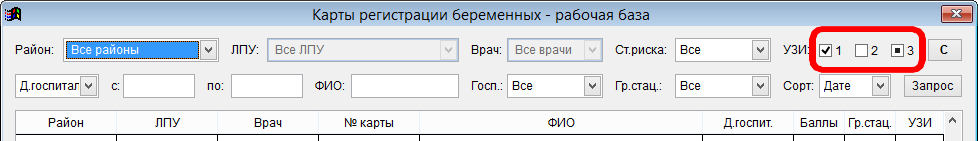 В верхней части списка карт находятся поля для выборки. Можно быстро выбирать карты по Району - ЛПУ - Врачу (для пользователей ОПЦ). Также можно делать выборки по: