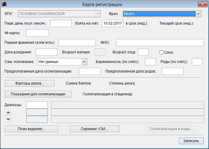 В режиме ввода данных нужно внести все паспортные данные по беременной, даты, а также факторы риска и показания для госпитализации в стационар соответствующего уровня. Для распечатки плана ведения беременной в соответствии с приказом № 572 нужно ввести правильные коды диагнозов по МКБ-10 в поля диагнозов. Можно ввести до 10 различных диагнозов, по которым и будут определены списки обследования.